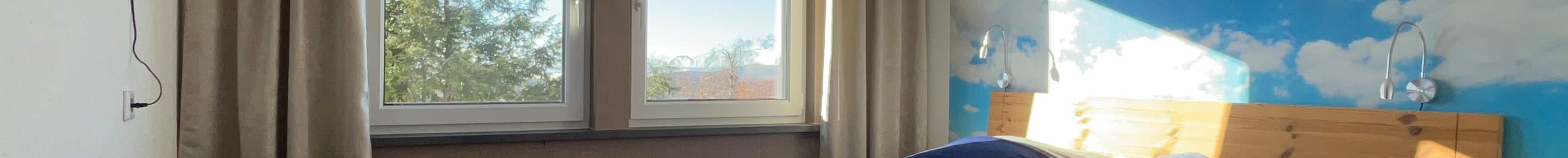 Modern eingerichtetes Einzelzimmer mit separatem Bad – auf Wunsch auch für einen Erwachsenen mit Kind geeignet. Von Ihrem Zimmer aus haben Sie einen wunderschönen Blick auf den Harz.